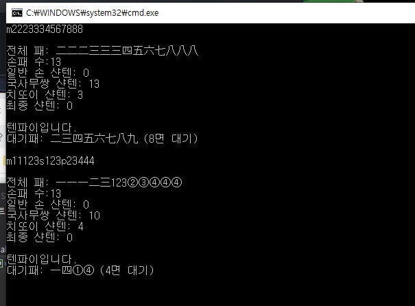 얼마 전에 일본 블로그에서 본 손패의 문자열 표현법(만 통 삭 자패를 m p s z로 표시, 가져온 패 뒤에 +-=기호로 대면 상가 하가 중 어디에서 울어갔는지 표시)을 참고로 해서 짜봤는데