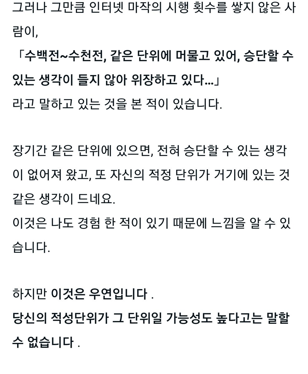 마작은 옳은 선택을 하고도 질 수 있고 잘못된 선택을 하고도 이길 수 있는 게임인데, 결과론을 떠나 결국 내 선택이 옳았는지 틀렸는지를 초보자가 알아차리기란 쉽지 않기 때문이다