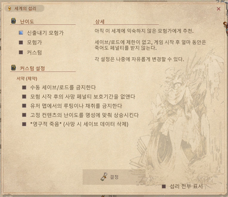 캐릭터를 만들고 나면, 『섭리』 를 통해 모험의 난이도를 조정할 수 있습니다.