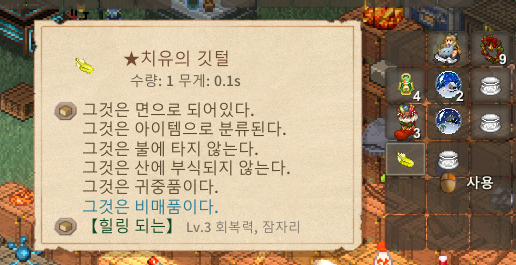 선물상자 자체는 매년 오지만, 아주 드물게 이 안에서 『★치유의 깃털』 이라는 레어 아이템이 나오기도 하는 거야. 성야제에서 살 수 있긴 하지만 정가가 1000000오렌이니까 혹시 얻었다면 소중히 보관하자구⋯