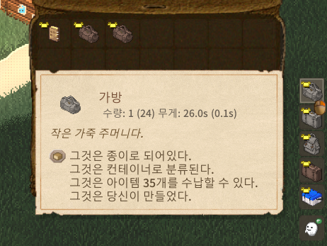 종이가방을 양산하게 되면 가장 먼저 할 일은, 게임 시작시부터 가지고 있던 템창 4칸밖에 안 되는 허접한 가죽지갑을 부수고 우측의 여분 소지품창을 모조리 종이 가방으로 교체하는 일이다. 지갑 버려버려.