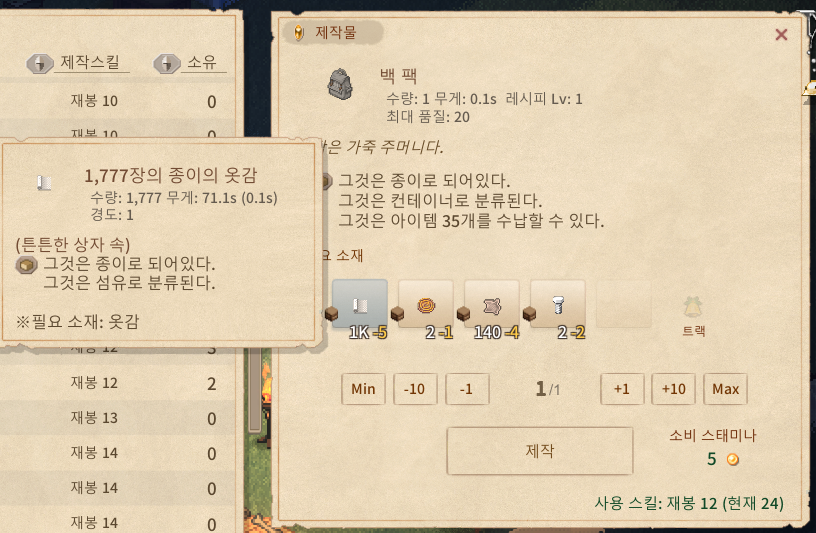 『종이의 옷감』 은 세상에서 제일 쉽게 구할 수 있는 소재이기도 하고(상인 캠프에서 전단지 99개 사서 해머로 부수면 됨) 나머지 재료도 구하기 어렵지 않기 때문에, 대여섯개 정도를 만들어 두면 인벤토리 문제로 곤란해질 일은 사실상 사라진다.