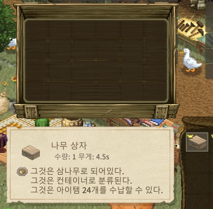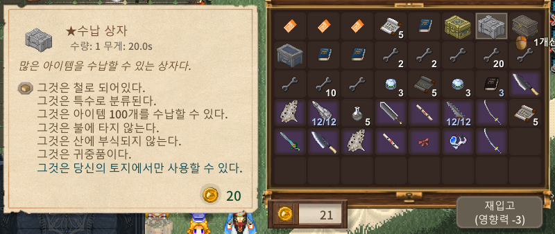 다만 게임 진행도가 중반 즈음으로 접어들면 20칸이라는 용량은 조금 빡빡하게 느껴지게 되므로, 보통은 레시피를 얻고 나면 35칸을 쓸 수 있는 『튼튼한 나무 상자』 로 갈아타게 된다.